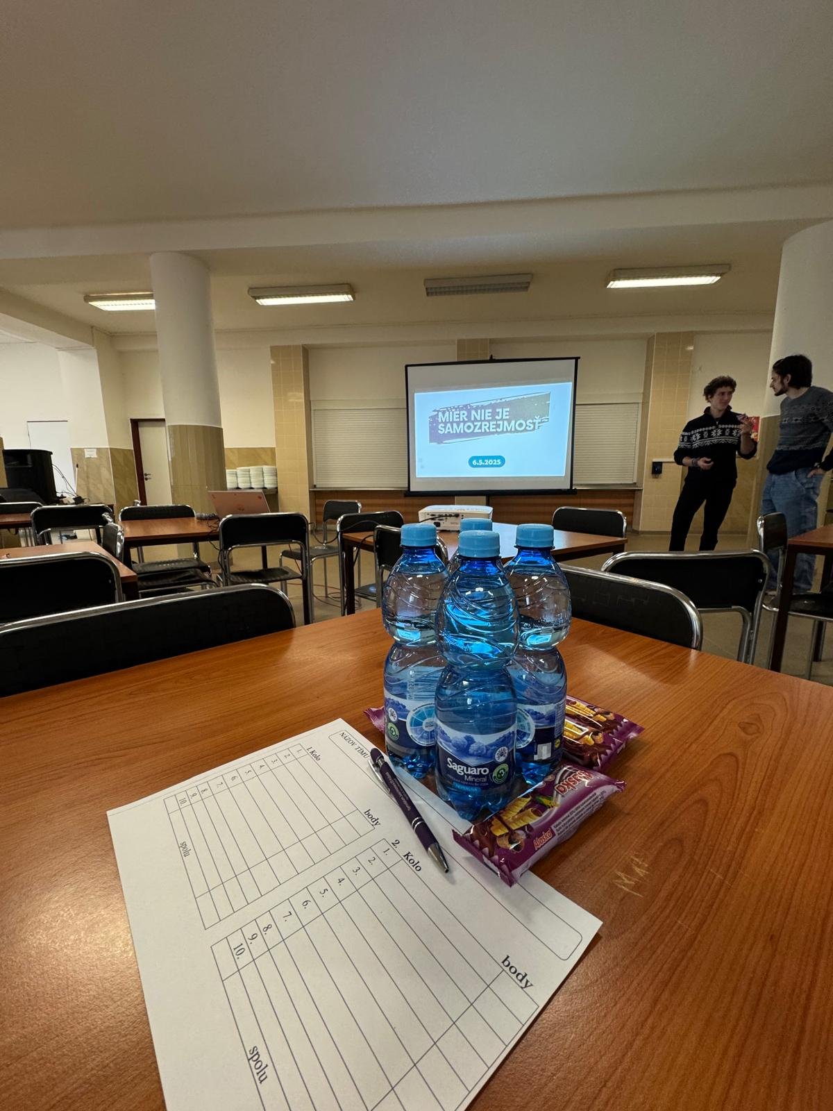 Ďalšou zaujímavou akciou v rámci celoškolského projektu MIER NIE JE SAMOZREJMOSŤ bol KVÍZ 6. mája 2025, prebiehajúci dopoludnia v školskej jedálni.