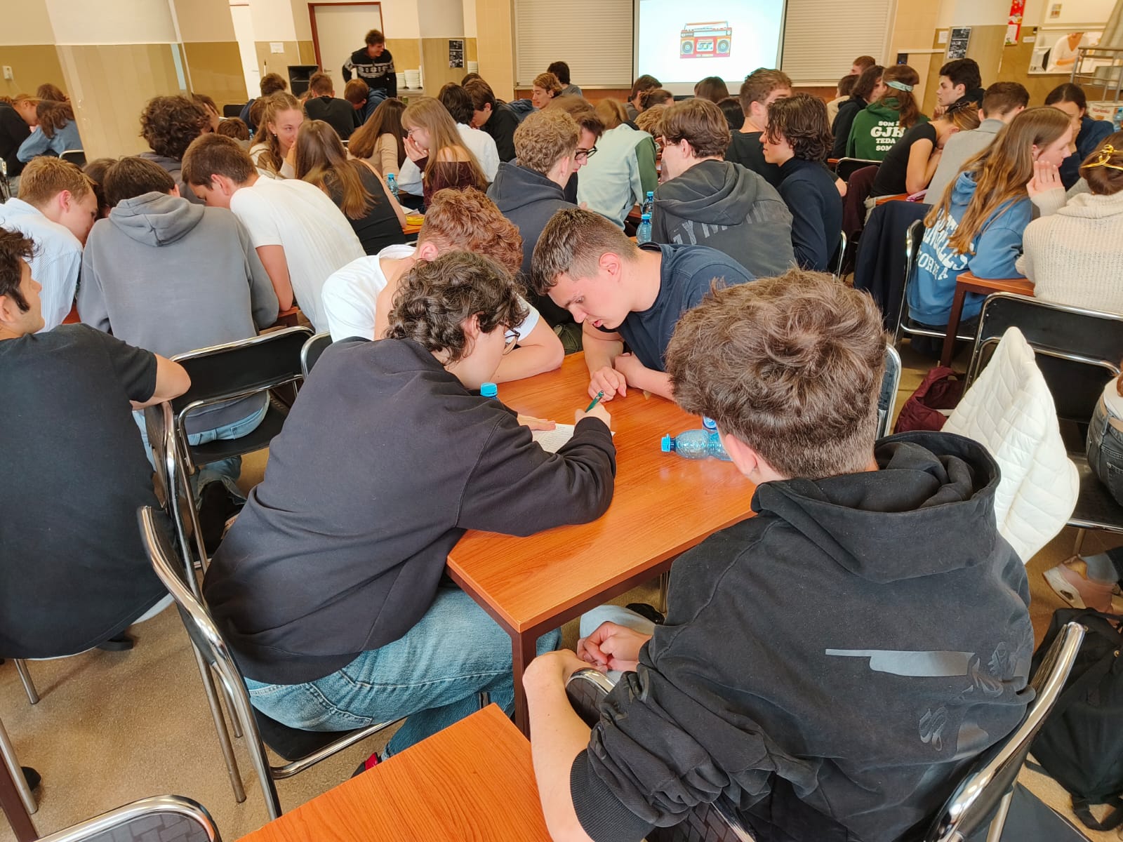 Kvízu sa zúčastnili štvorčlenné družstvá zo všetkých tried veľkého gymnázia + KVARTA.